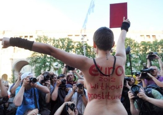Μια εκπρόσωπος, από την Ουκρανία, του γυναικείου κινήματος διαμαρτυρήθηκε γυμνή προκειμένου να σταματήσει η πορνεία. Η γυναίκα επηρεασμένη από το EURO 2012, το οποίο θα διοργανωθεί φέτος στην Ουκρανία, κράτησε μια κόκκινη κάρτα για να περάσει το μήνυμα της.