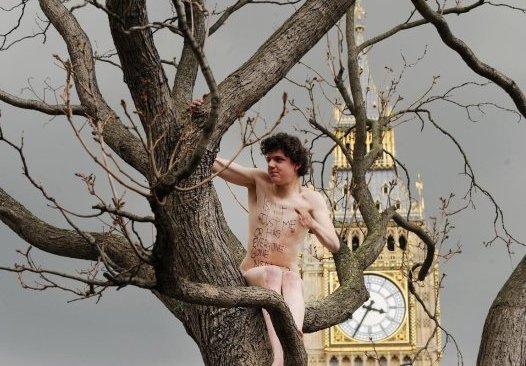 Ένας άντρας γυμνός σκαρφάλωσε σε ένα δέντρο μπροστά από το Big Ben κατά την διάρκεια διαμαρτυρίας της Πρωτομαγιάς το 2010.